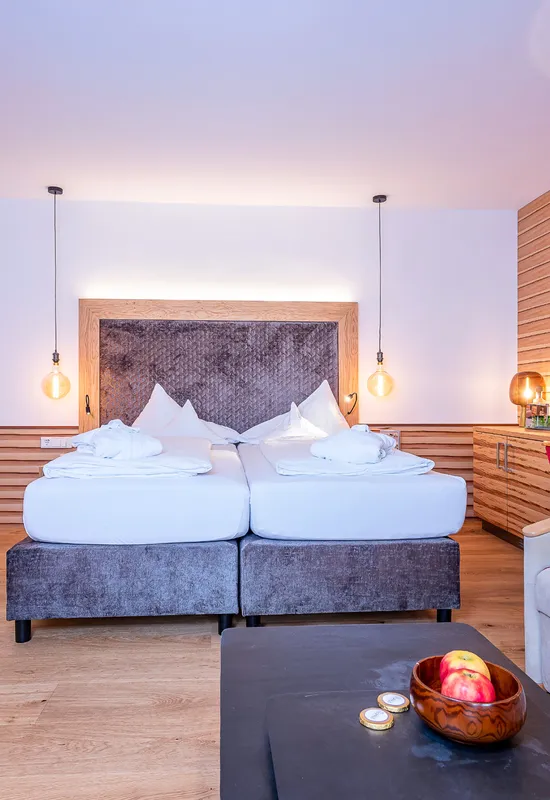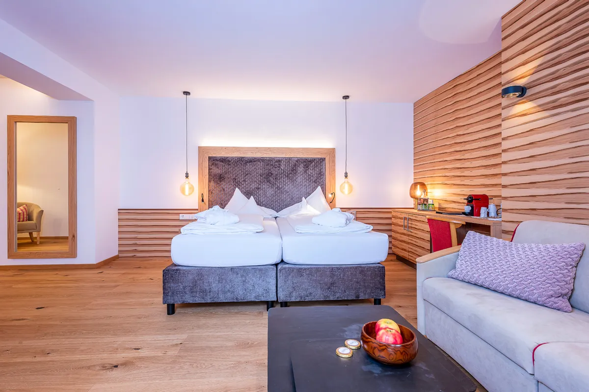 Unsere Suite Deluxe 2 eignet sich hervorragend für einen unvergesslichen Familienurlaub für 2-4 Personen. Das Zimmer verfügt über ein abgetrenntes Elternschlafzimmer mit Boxspringbett, sowie ein separates Kinderzimmer mit  einem Stockbett. Ebenso verfügt das Zimmer über eine gemütliche Sitzecke und einen begehbaren Kleiderschrank. Das Badezimmer verfügt über eine großzügige Regendusche und der WC-Bereich ist abgetrennt.