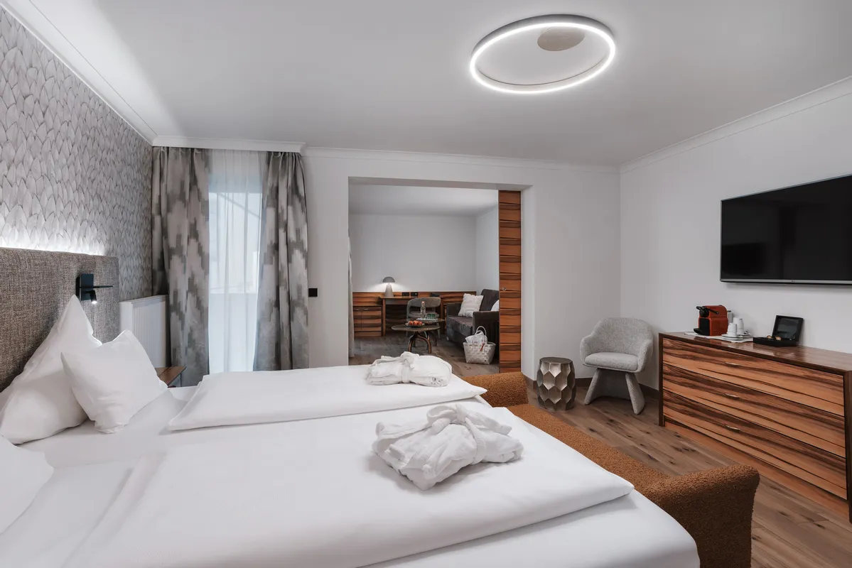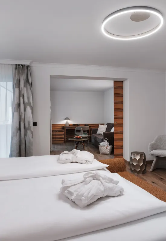Auf insgesamt 55m² Wohn- und Schlaffläche, bietet Ihnen unsere exklusive Suite "Superior" mit abtrennbarem Wohnbereich inklusive Sitzecke mit Couch einen Urlaubsgenuss der Extraklasse. Mit den hochwertigen Doppelbetten und dem begehbaren Kleiderschrank, erwartet Sie ein unvergesslicher Urlaub. Das Badezimmer verfügt über eine Badewanne und der WC-Bereich ist abgetrennt.